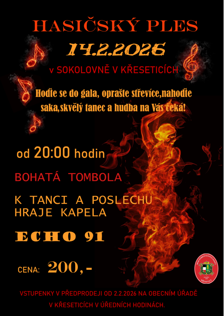 Hasiči obce Křesetice srdečně zvou všechny občany na Hasičský ples, který se uskuteční 14. února 2026 v sokolovně v Křeseticích. Ples začne v 20:00 hodin a návštěvníci se mohou těšit na bohatou tombolu. Přijďte si užít příjemný večer plný zábavy a společenského setkání. Těšíme se na vaši účast!